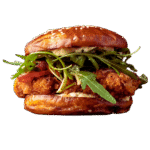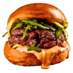 Steak 150gm, Chevre, miel, oignon caramelise, iceberg, sauce maison